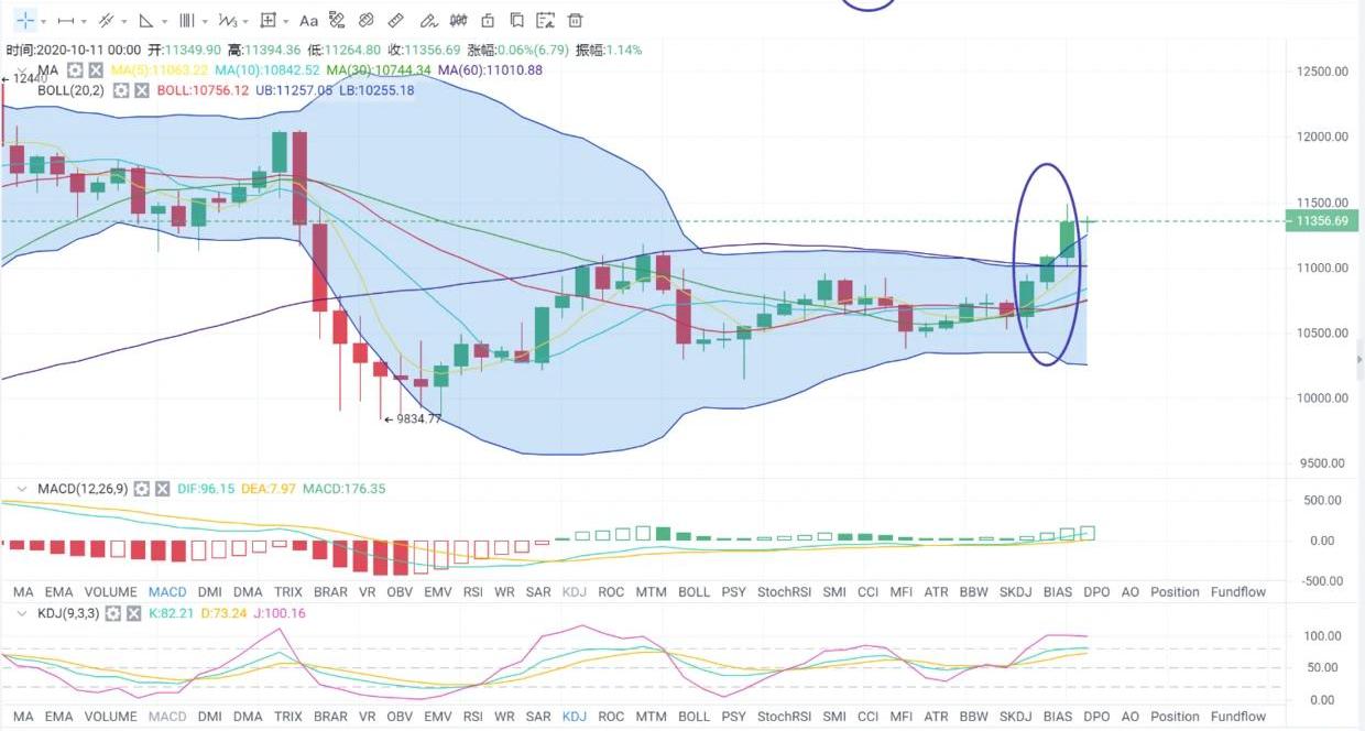 10月以來,大餅行情在雙節之日就已經開始了大動作,1號開始先上沖10900價位附近后,稍稍盤整后開始大幅下跌,于10月2號最低觸及10370價位附近;然后大餅開始緩慢上行,在6號日間再次反彈至10800價位,隨后又開始回調,回到10530附近盤整,于7號、8號兩天盤整在10530-10700區間;8號晚間大餅正式開啟上升浪,經過A、B、C三浪上升之后,目前盤整在11350附近;但是三浪上升就僅僅三浪嗎?