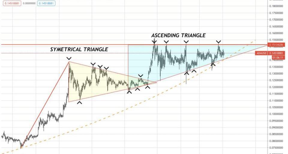 ADA近期出現多個看漲形態。ADA目前在一個上升三角形形態內交易。上升三角形有多個接觸點,加大了驗證力度。在上升三角形之前,ADA出現了一個對稱三角形形態。這一對稱三角形形態顯示有一個積極的突破,且之前有一個積極的趨勢。