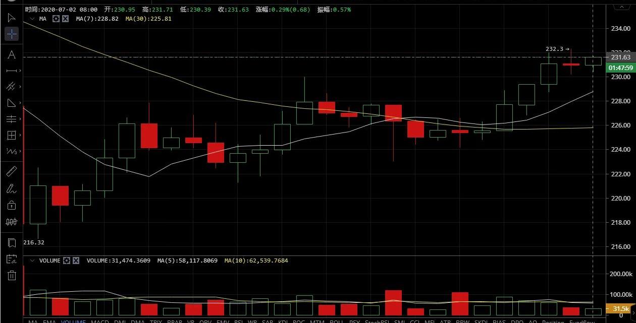 昨日晚間以太拉升力度比大餅更強,但同樣相比于大餅,以太回調幅度較小,后期所需同步,以太今日勢必還將有一波小幅回調,下方關鍵支撐主要看228。從四小時線來看,晚間觸及232位置附近受阻稍有回落,RSI指標進入超買區后開始反彈調整,KDJ即將進入超買區已時有拐頭向下跡象,短期內將會有一波回踩而與大餅到達同步,但后續行情行情主要方向仍然還需繼續看多,今日七月建議可以先把握短空利潤。