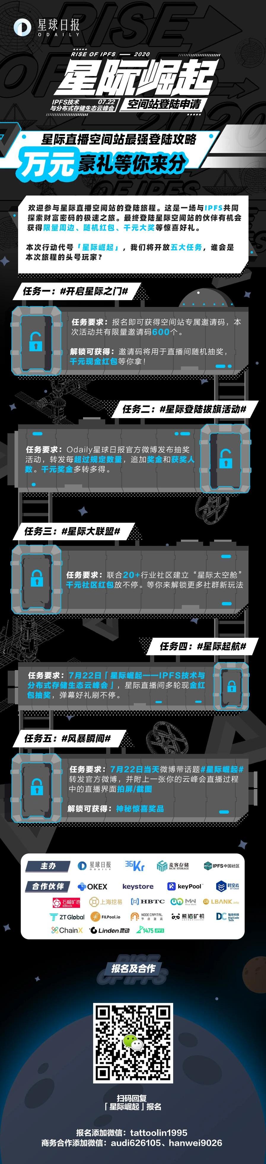 誕生于2014年的IPFS終于在2020年迎來「落地」的高光時刻。站在IPFS生態崛起的開端,Odaily星球日報聯合36kr、麥客存儲、IPFS中國社區將于7月22日舉辦「星際崛起——IPFS技術與分布式存儲生態云峰會」。我們將與去中心化存儲生態的建設者、破局者、引領者一起,探討技術與應用,機遇與挑戰。