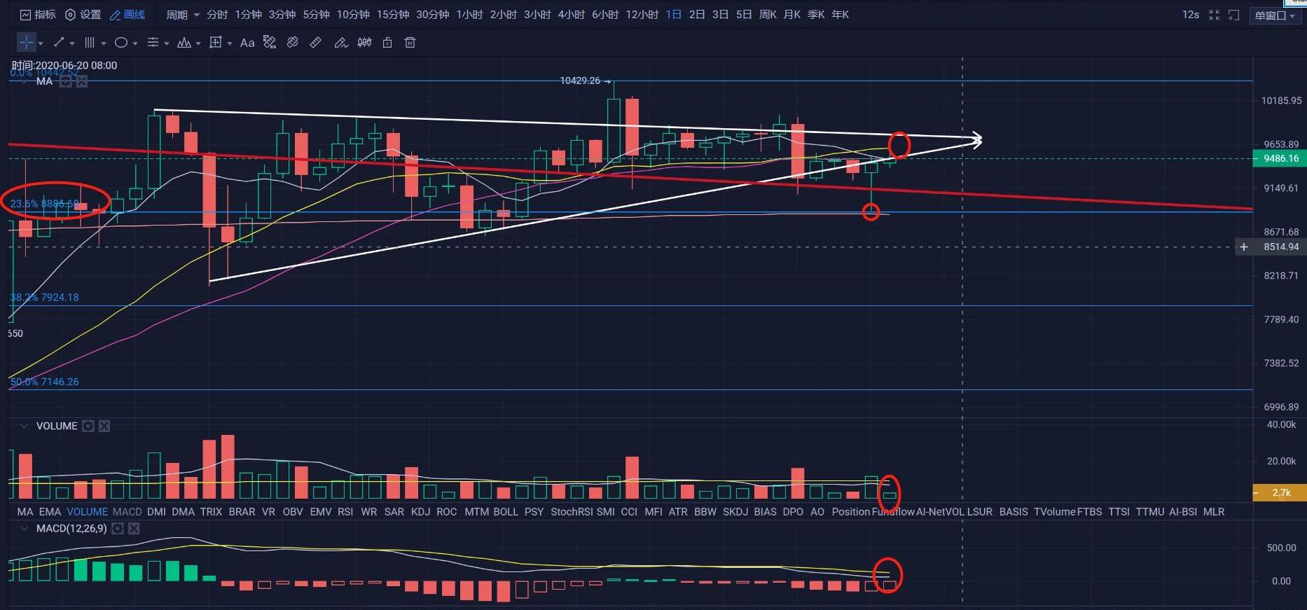 XRP/HKD-2.17%比特幣觸底反彈,成功回補9450缺口后,最高達到9580附近,目前在9480附近震蕩。從昨日的測試位置來看,在年線的附近,也是斐波那契23.6%的位置。