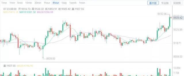 昨日我們分析,4H周期升破9400,是為了均線的翻轉,然后回調,等待均線聚集能量集中再往上行,但昨天不靠譜升級矛盾,對整個數字貨幣市場影響較大,BTC和ETH在4H周期沒有進行調整,僅僅在30分鐘周期進行了小級別的調整之后,便上行。