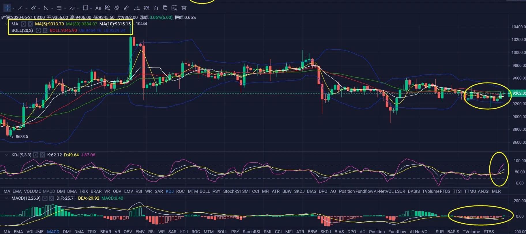 再從4小時圖來看一下,隨著今天早間的一波反彈,BOLL通道由下行逐漸變為現在的平行運行,行情已經成功站上了BOLL中軌,位于中上軌區域運行,但是上方依然承壓在綠色MA30(9385)均線處;下方KDJ指標已經金叉向上運行,能量指標MACD快慢線粘合運行且有抬頭向上的跡象,多頭能量已經開始釋放了;綜合來看,易天(aphz8705)認為比特幣短周期內還會有一波反彈,上方壓力位重點關注MA30(9385)均線以及BOLL上軌(9465)處!