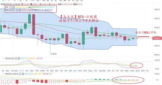 我們從日線上來分析一下,雖然這么多天的上漲下跌,行情劇烈波動,但是依然是處于高位的箱體內,今天日線開盤于9169.0一線,早間就來了一波先漲后跌,目前行情又開始位于黃色MA5日均線處盤整,上方一直受到BOLL中軌壓制;上方藍色MA10和綠色MA30日均線開始下移,匯合于BOLL中軌處,對比特幣行情進行上方壓制;下方KDJ指標三線已經抬頭上攻,有繼續形成金叉跡象;能量指標MACD快慢線粘合運行在零軸下方,紅色空頭能量柱微弱釋放中;綜合來看,易天老師aphz8705認為日間行情依然會先多次試探上方壓力位9200關口!