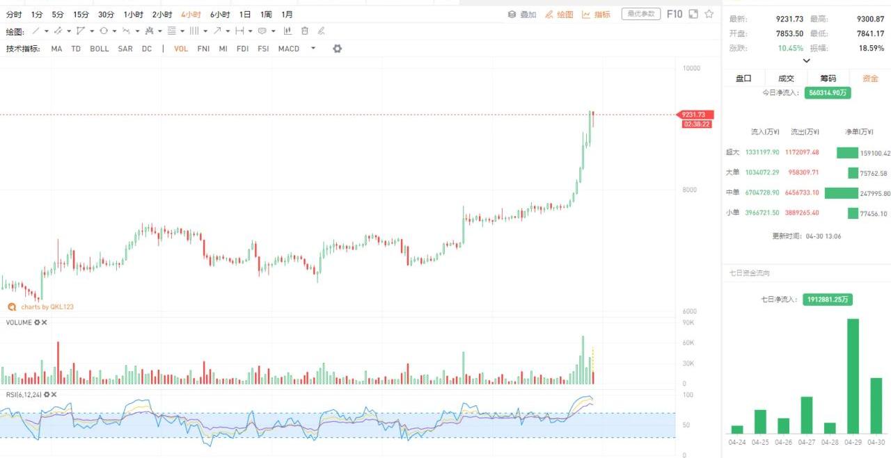 昨日下午BTC迎來變盤向上,沒想到走勢會如此之強。站上8000美元之后,出現明顯的放量拉升,并在8800美元稍有調整之后,今日直接沖上9000美元關口。比特幣的再次放量走出,可以作為熊轉牛信號,后續走勢看好,大概率會走出一波行情。但短時RSI超買嚴重,有一定的回調需求。