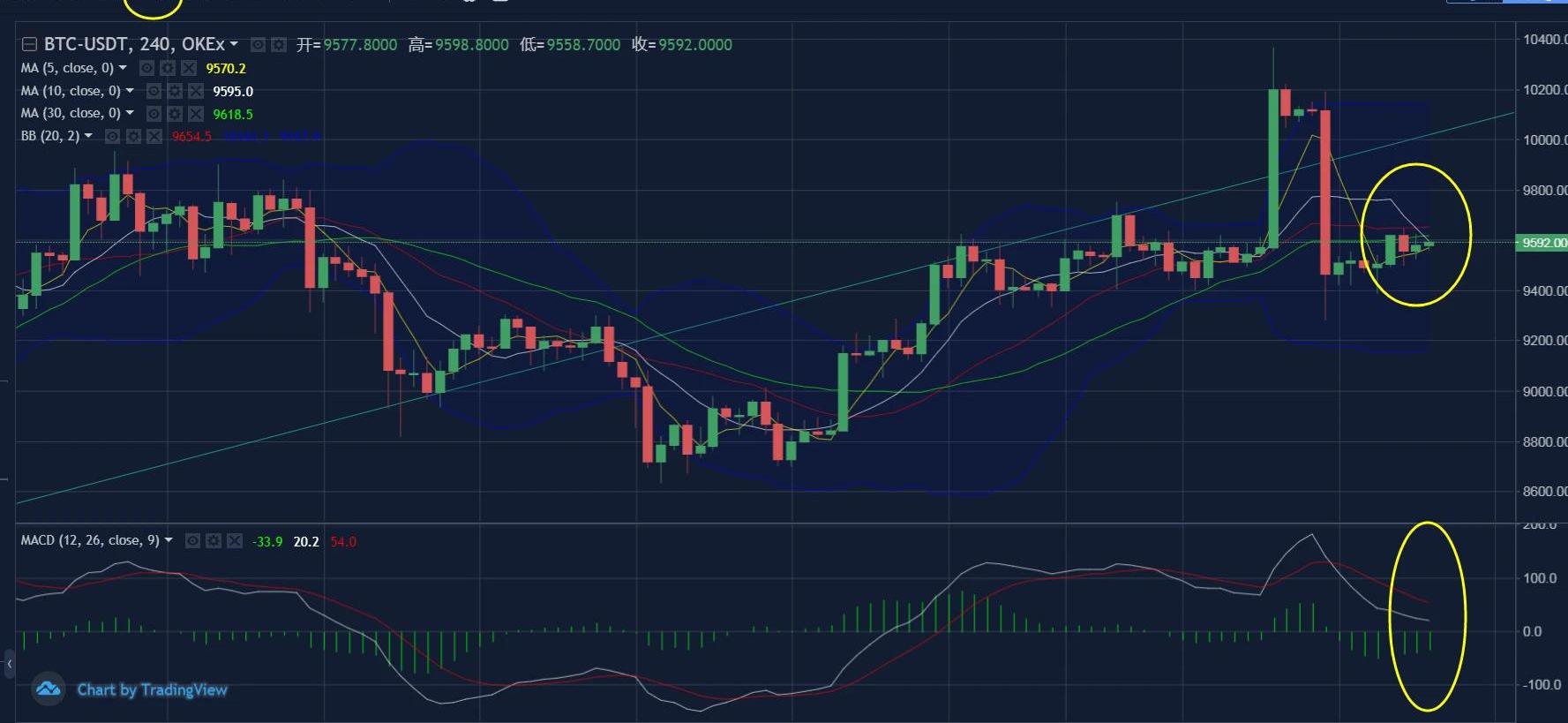 再從4小時圖上看,隨著前天的大餅急漲暴跌之后,雖然BOLL通道已經再度歸于平行,但是較于之前,上下軌之間的區域確實大大增加,隨著圖中的大陰柱插下來,直接從上軌壓力位承壓一路貫穿各均線和中軌的支撐,停于BOLL中下軌通道中,目前行情一直維持在9582一線附近上下震蕩,上方阻力位已經匯合,白色MA10、綠色MA30以及BOLL中軌機會粘合于一處形成上方阻力區域;下方能量指標MACD快慢線依然位于零軸上方死叉運行,但是隨著水下空頭能量的逐漸縮減,白色快線有緩緩抬頭的跡象;如成功上穿慢線形成金叉跡象,那么對于上方壓力區域的壓制,易天認為今日有望突破!