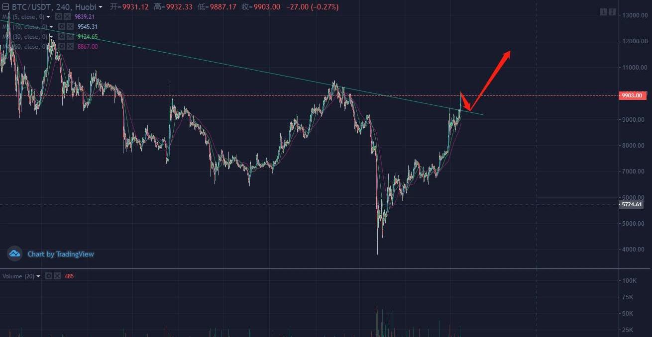 比特幣近幾天我們一直關注日線級別9400關鍵位置,結果晚上有效突破,迅速上漲,且今天上漲至最高點10060附近。