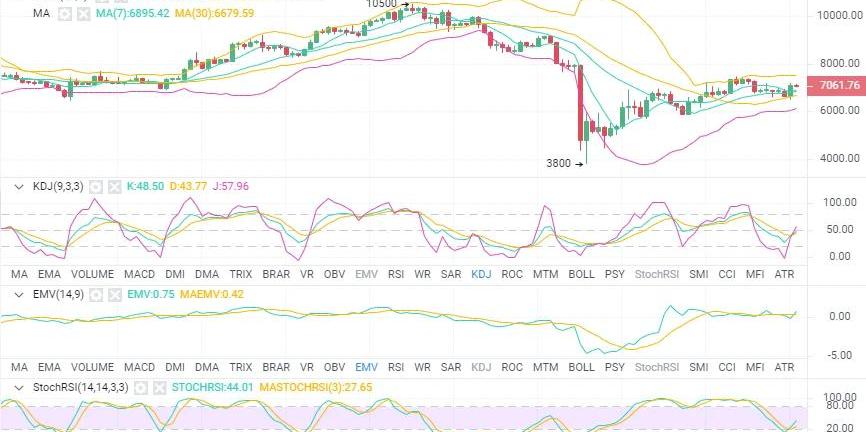 昨日行情早間先走瀑布下行,直接快速下探6480一線后開始向上反彈,而后持續到午間一直徘徊6650上下整理運行,下午行情開始發力上行,一舉上揚至6980一線后晚間續漲至7180一線才開始承壓回落,晚間至凌晨整理與7000附近整數關口。整體運行節奏上面屬于先跌后漲,完美誘空之后殺空,也有消息面的帶動效果。