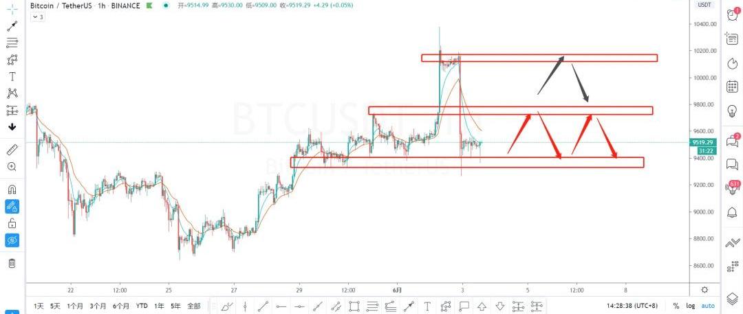 9350-9750之間高拋低吸,如果9750壓不住可能會去試探前高,只要不破前高均是可以介入的優質做空機會,如果向下破位則可輕倉追空,下一個支撐在8800-9000