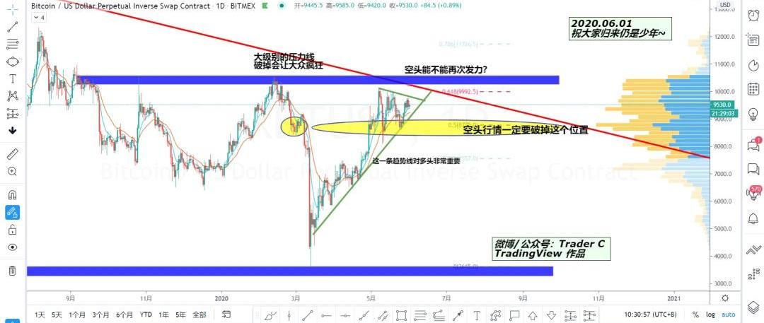 2:最后的壓力:歷史高點下來形成的強大供給會給造成非常強大的賣壓,而這個價位目前來說在10000-10500區間,空頭如果要發力,最后的防線必須要在這里了,一旦突破,就是一大段上攻。