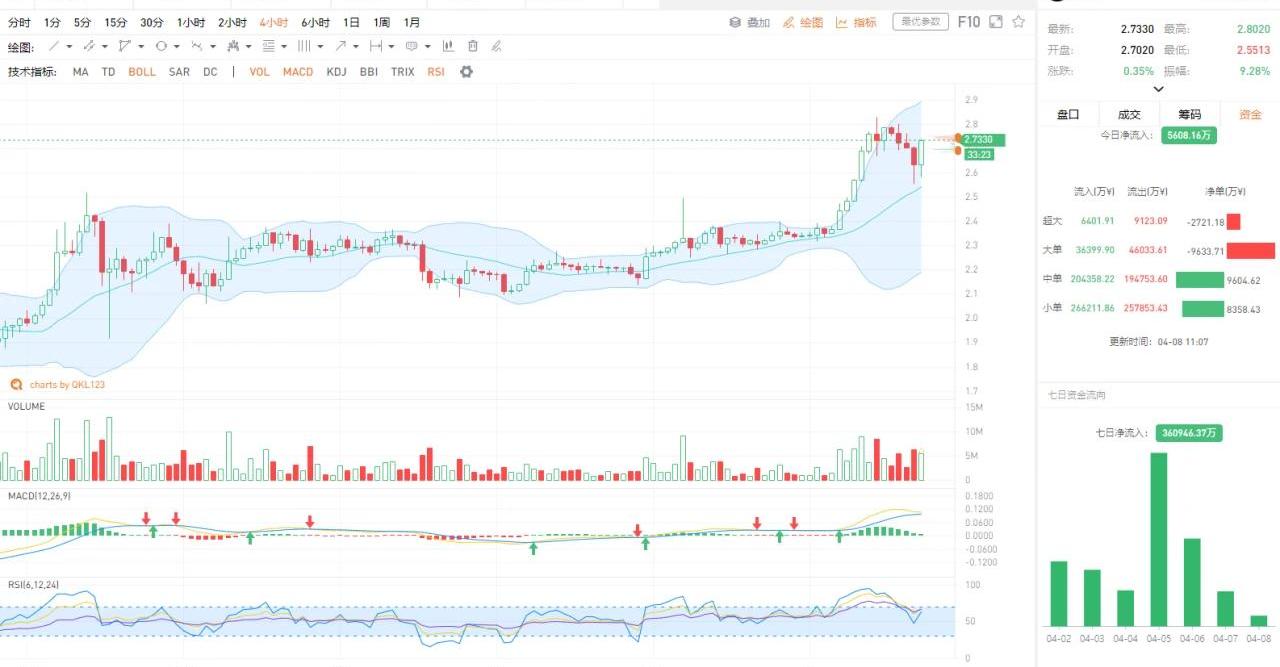 EOS走勢和LTC相近,短時企穩上行,試探上方壓力2.8美元。