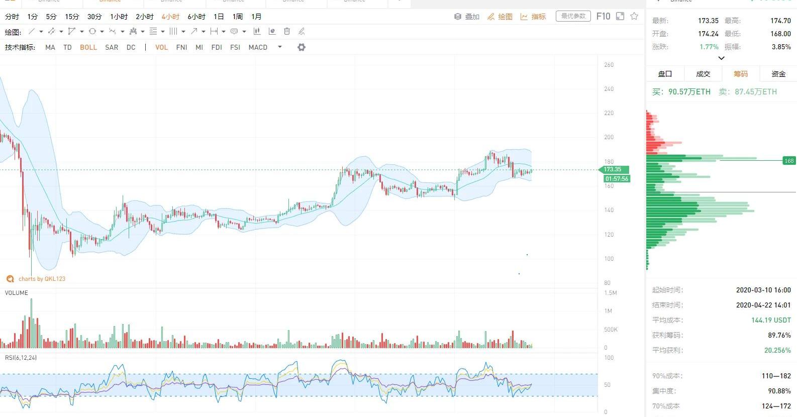 ETH在170美元籌碼集中區域徘徊,目前試探四小時K線布林帶中軌,短時臨近中軌不確定性較大,聯動BTC為主。