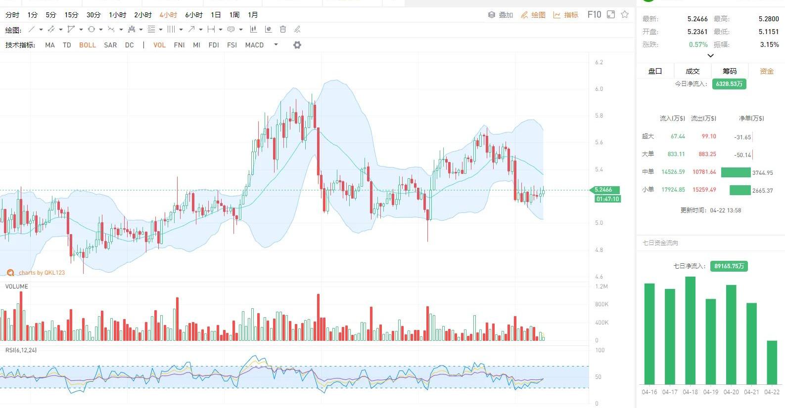 EOS從昨日低點反彈后進入橫盤狀態,短時上攻不強,市場資金流大單小單存在明顯,繼續聯動ETH為主。