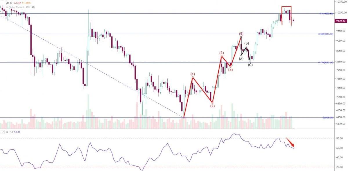 能否反彈過10111,要看今天能否守住9840。如果跌破9840,則希望渺茫。