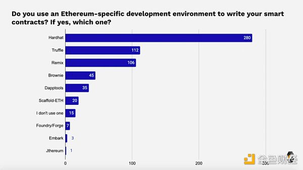 Hardhat 成為最受歡迎的以太坊專用開發環境,近 45% 的受訪者使用它,Truffle 和 Remix 緊隨其后,各自的用戶份額約為 17%。
