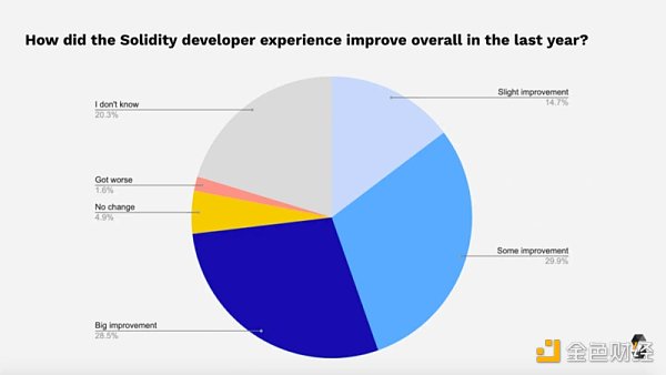 大多數人(大于 70%)認為 Solidity 開發人員的體驗在去年有所改善,只有 1.6% 的人認為情況變得更糟。