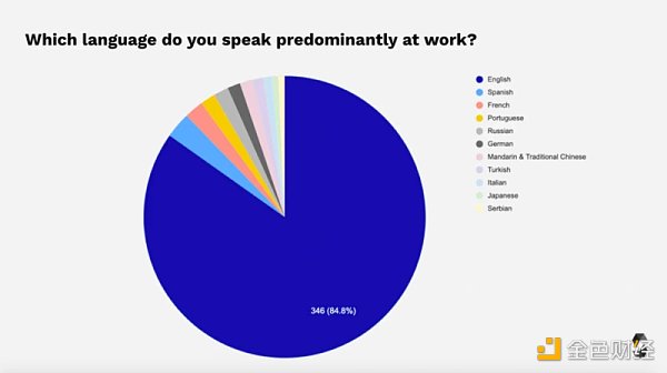 超過 80% 的受訪者在工作中主要使用英語。一些受訪者還在工作中說西班牙語 (2.8%)、法語(2.1%)、俄語(1.6%)或葡萄牙語(1.6%)。