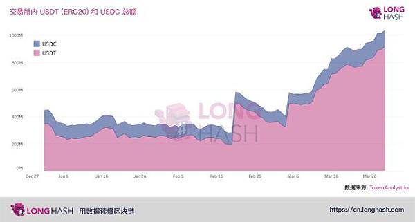 投資者拋售比特幣并買入穩定幣意味著什么?至少從短期來說,這不是看漲的信號。截至3月3日,交易所上 USDT 和 USDC 內的資金還只有 4 億美元。在不到四個星期的時間內,總余額迅速增加了 150% 。