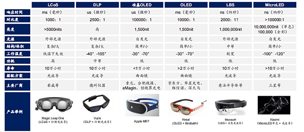 當前已提出的微顯示技術包括 OLED(有機發光二極管)/ LCoS(硅基液晶)/ DLP(數字光處理)/LBS(激光束掃描儀)等待,但這些技術均無法兼顧成熟性、性能、成本等指標。MicroLED 是業內公認的 AR 顯示最佳解決方案,但存在技術尚不成熟、量產難度大等問題,真正大面積商用可能要到 2025 年左右。