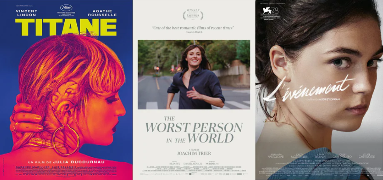 Titane. Dir. Julia Ducournau The Worst Person In The World. Dir. Joachim Trier Happening. Dir. Audrey Diwan