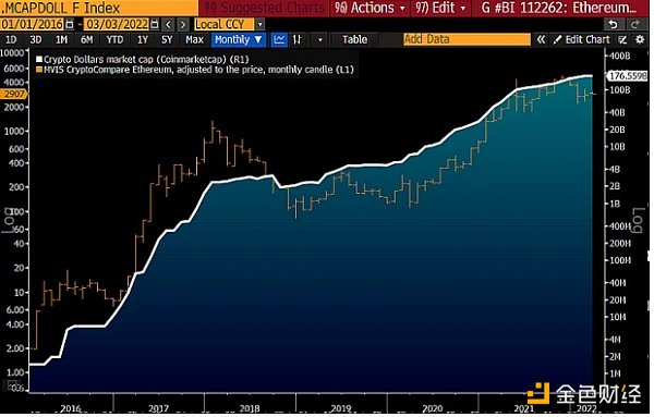 加密美元(穩定幣)和以太坊將迎來新一波大牛市?在烏克蘭沖突期間,美元正在證明其持久價值,不僅如此,在加密貨幣中美元其實也大獲全勝。以太坊區塊鏈上出現了許多穩定幣,這些基于美元的穩定幣進一步鞏固了以太坊價格,同時越來越多其他加密貨幣也都使用美元進行交易。3 月 2 日,Coinmarketcap 上前六名加密貨幣的市值達到 1760 億美元,比 2021 年初增長了約 5 倍,Bloomberg Intelligence 認為幾乎無法阻止頭部加密貨幣市值達到數萬億美元。