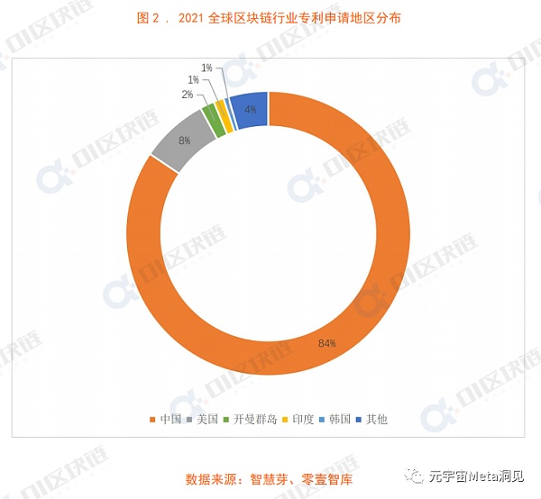 從2021年全球區塊鏈技術來源地區看,中國區塊鏈申請量達15985,占全球申請總量的84%,位居第一。而排名第二的美國占比8%(1456起),隨后是開曼群島、印度和韓國,分別發生309和217和108起。從數據中可以看出,全球區塊鏈技術的研發分布極其不均,而中國在區塊鏈技術的研發中位居世界前列。