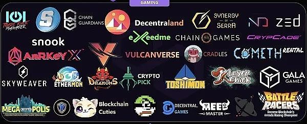游戲:Axie Infinity(P2P游戲)、Decentraland(虛擬空間游戲)等。