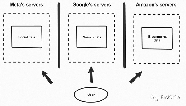 今天,如果一個用戶正在瀏覽一個網站,他們產生的數據會被儲存在兩個主要位置——瀏覽器和公司擁有的數據庫。如果你在Facebook注冊并創建一個賬戶,那么關于你的賬戶和第一篇文章的數據將直接進入Meta的服務器。如果你再去創建一個Gmail的賬戶,那么就會被單獨存儲在谷歌的服務器上。這種方法被稱為以應用為中心的數據存儲模式。