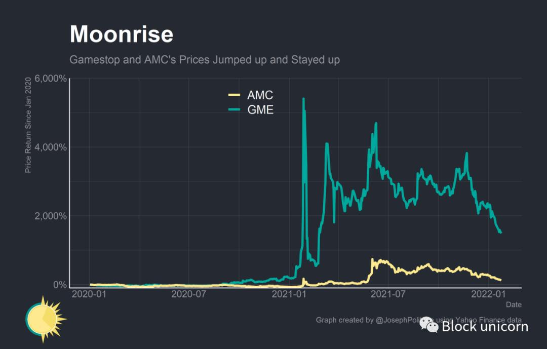 所有這一切都在 2021 年 1 月達到頂峰,當時苦苦掙扎的視頻游戲零售公司 GameStop 成為金融界的焦點。故事是這樣的,對沖基金做空了這只股票——借入股票并立即賣出股票,押注 GameStop 的股價會下跌。WallStreetBets 的用戶將極高水平的空頭興趣(賣空的股票數量超過現有股票)視為一個機會。如果他們能夠推高 GameStop 股票的價格,賣空者將不得不以更高的價格買入,以彌補他們在重大損失的頭寸。因此,他們大量收購了 GameStop,導致其價格飆升,而華爾街對沖基金則以該公司為賭注。GameStop 的股價從擠壓前的 20 美元漲到了近 500 美元,在其成功之后,交易員轉向其他持有大量空頭興趣的股票(如陷入困境的電影院公司 AMC)。直到 Robinhood 和其他經紀公司完全暫停了 GameStop、AMC 和其他幾只「表情包股票」的交易——有效地切斷了表情包狂熱的勢頭。