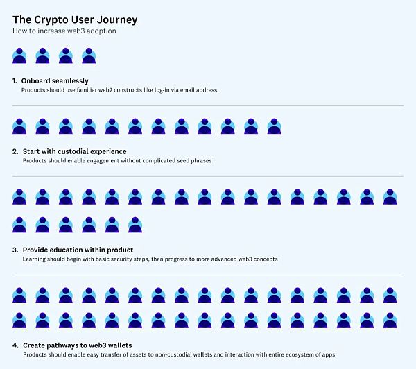 這張圖顯示了更廣泛地采用完整的web3體驗的途徑——以及人們舒適地從托管系統轉移到非托管系統所需的簡化的用戶旅程。