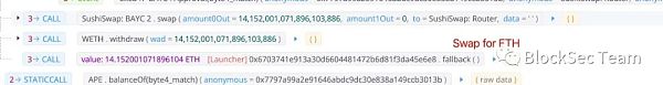 攻擊者需要歸還借出的BYAC Token。因此它將獲得BYAC NFT mint獲得BYAC Token。這個過程中,他還將其自己的編號為1060 NFT也進行了mint。這是因為需要額外的BYAC Token來支付閃電貸的手續費。然后將還完手續費后的BYAC Token賣出獲得14 ETH。