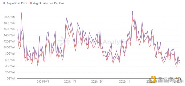 從上述數據中,我們可以明顯的看到市場對以太坊區塊空間的需求開始減少。從去年5月份起,隨著NFT和GameFi的大火, 以及一直在市場活躍的DeFi,以太坊上的Gas費也開始水漲船高,眾多新興公鏈也開始針對不同的市場痛點爭相上線,以至于當前的以太坊市場份額已掉至60%以下。