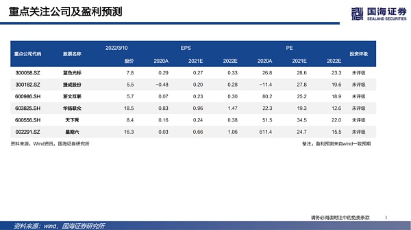 投資建議:虛擬人產業鏈主要包含基礎層(建模/渲染引擎等基礎軟硬件)、平臺層(動捕等軟硬件系統、垂直平臺、AI廠商)以及應用層,隨著底層技術硬件等突破,將賦能更多應用場景,基于此,給予行業“推薦”評級。頭部綜合大廠在技術沉淀、IP運營、流量有較好基礎,偏好探索底層技術、硬件架構以及針對公司業務應用做工具化產品,產業鏈布局相對全面,如海外Meta、Google等;國內騰訊、阿里、B站、網易、百度、字節等。A股傳媒公司主要涉及平臺層垂直解決方案提供以及應用層,建議重點關注:藍色光標(與微軟小冰合作上線“分身有術”數字人驅動平臺SaaS產品;與阿里達摩院共推虛擬主播直播電商解決方案;自營/品牌定制虛擬人)、捷成股份(參股公司世優科技提供廣電媒體、虛擬主播直播及虛擬場景、影視動畫虛擬內容制作等多個場景的成熟技術產品和解決方案,計劃推出MetaAvatarShow元宇宙分身、浙文互聯(自主孵化的虛擬網紅君若錦、LAN_蘭,已有汽車/食品/電商等代言訂單;DIGITALHUMAN平臺落地;定增計劃投入部分資金于虛擬數字人領域技術開發)、華揚聯眾(推出虛擬形象Aimee并進行商業化嘗試;推出景甜、Angelababy虛擬形象)、星期六(2022年計劃推出虛擬人或將作為虛擬主播參與直播帶貨等)、天下秀(上線網紅元宇宙虛擬社交社區Honnverse虹宇宙,知名虛擬紅人魚太閑上線虹宇宙)等。其他建議關注:應用營銷領域利歐股份、天舟文化、天地在線等;硬件動捕方向利亞德;AI方向科大訊飛、商湯科技等。