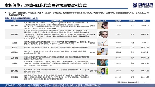 (1)虛擬偶像:初音未來、洛天依等初代二次元虛擬偶像誕生于2010年后,以CG技術合成+雅馬哈VOCALOID系軟件合成聲音,其呈現形式和商業化場景隨技術進步持續豐富;字節跳動及樂華娛樂于2020年推出虛擬偶像團體ASOUL,并迅速成為頂流;燃麥科技于2021推出虛擬超寫實數字人AYAYI、創壹科技于2021年推出超寫實虛擬UP主柳葉熙,主要呈現形式分別為靜態圖片和視頻。虛擬偶像盈利模式主要為演藝活動、直播帶貨、直播打賞及商業代言,周邊衍生開發潛力大。頭部虛擬偶像直播坑位費、打賞收入可比肩頭部真人主播。商業代言方面,頭部超寫實虛擬偶像已收獲10個以上的代言。據艾媒數據,2020年中國虛擬偶像核心市場規模為34.6億元,YOY+69.3%;帶動市場規模為645.6億元,YOY+70.3%。