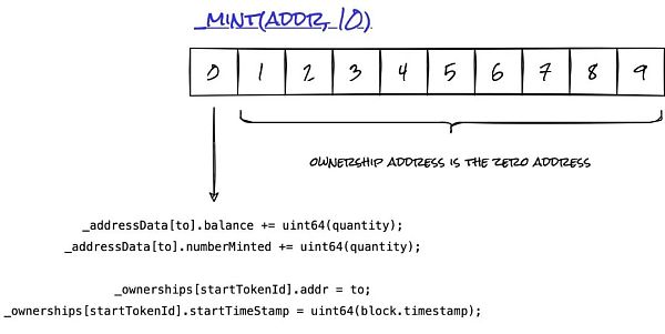 ERC721A所采用的方法乍一看似乎是反直覺的,所以讓我們來看看在不同操作期間如何寫入和讀取存儲以達到合約的正確狀態。