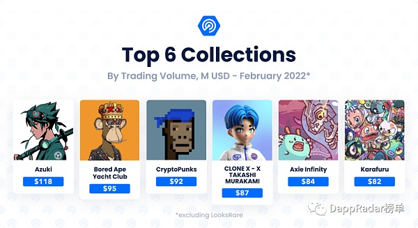 該領域的另一個積極趨勢是,Clone-X和Azuki等新項目在該領域產生的影響。Azuki是2月份交易量最大的系列(不包括LooksRare的活躍),超過了Bored Ape Yacht Club、CryptoPunks等知名項目。最近推出的項目需求一直很強勁,Karafuru、Cool Pets、Invisible Friends和其他幾個本月交易量最大的系列就證明了這一點。