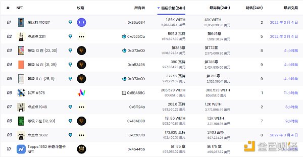 24小時內銷售漲幅前十的NFT 數據來源:NFTGO