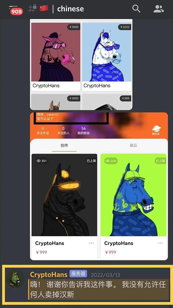 于是,有好奇的網友給CryptoHans求證其作品是不是在中國發售了。得到的回復是:目前,我們的NFT只在OpenSea上銷售。
