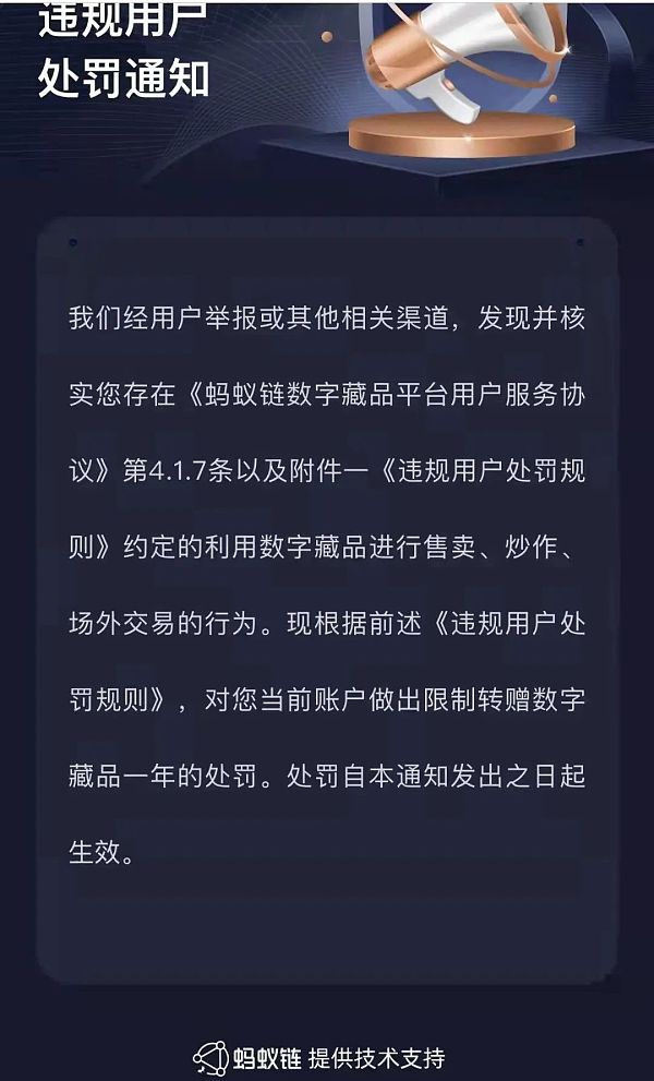 中介如此迅速的改口不僅是為了“保護”數字藏品買賣雙方的賬號,更是為了規避個人的風險。此次用戶協議不僅對上次處罰違規轉售藏品行為進行了補充,更是直接將“組織數字藏品場外交易”明文規定為違規行為,并指出該行為若是“構成犯罪的,報警并依法移交司法機關處理”。