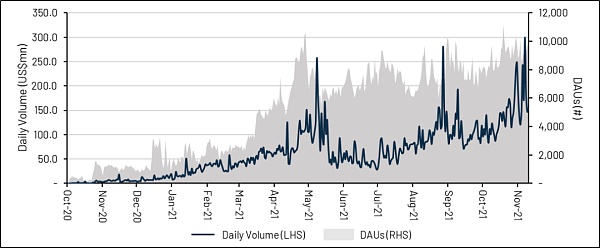 Metamask主要通過嵌入互換功能(swap)獲利,該功能聚合來自去中心化交易所聚合器、做市商和DEX的數據,并在此基礎增加0.85%的互換費用。自今年年初以來,互換功能的采用率顯著增長——Metamask上個月從其互換中賺取了大約4000萬美元的互換費用。