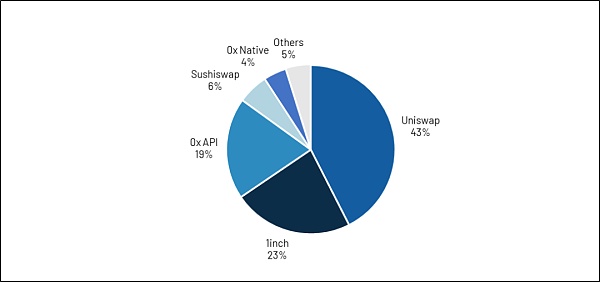 Uniswap和以太坊DEX及DEX聚合器1inch分別構成了Metamask的大部分流動性來源。