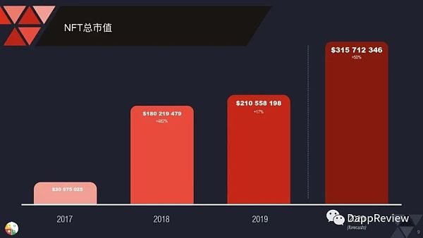 根據DappReview《2019NFT年度報告》數據顯示,2020年NFT的市值與交易玩家數據均有了大規模上漲。根據DappReview的數據,NFT的總市值從2018年的1.8億美元,上升到了2019年的2.1億美元,預計2020年將增長到3.15億美元。