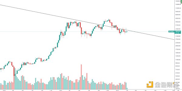 上周周線收倒錘子陽線,根據長腿必踩原則,后面有再次向上試探的可能,周線上方主要壓制依舊是一頂65000美金下降趨勢線,自前期觸底33000美金啟動反彈以來到目前雖然多次插針站上該趨勢線,不過周線均未有效突破,包括上周最高拉升至45400美金,不過收線還是跌回至該線下方,所以后面反彈繼續關注該線壓制,本周壓制位41000美金附近,周線一旦有效突破,上行空間將繼續拉大,下方關鍵支撐依舊是36000-36400區間。