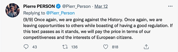 (9/9)我們又一次違背了歷史。我們把機會留給了別人,卻自詡有一個好的法規。如果這個文本按原樣通過,我們在行業的競爭力和歐洲公民的利益方面會付出代價。