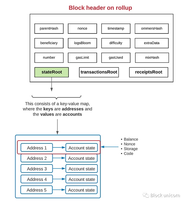 “狀態根”由一個鍵值映射組成,其中鍵是地址,值是賬戶。每個賬戶最多有 4 個屬性:余額、隨機數、代碼(僅適用于智能合約)和存儲(僅適用于智能合約)。?