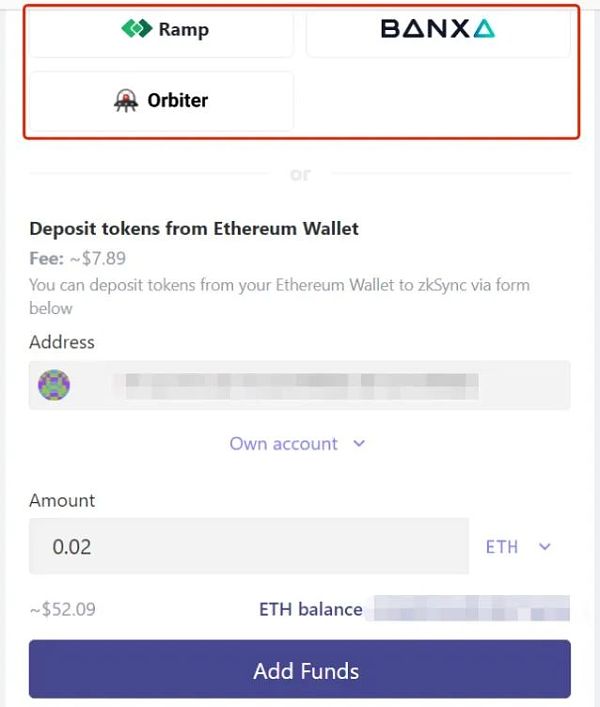連接完畢后,由于我們在 zkSync 這個二層網絡里面沒有資金,所以需要點擊+ Add Funds,把準備好的 ETH 存進二層網絡。