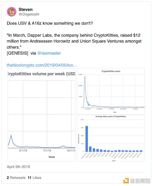 就在Dapper Labs正式成立并募集到$1200萬的一個月后,市場急轉直下,進入加密寒冬。10月,以太坊價格從1月的最高點暴跌85%,加上加密貓的交易量日益下降,團隊2018年10月通過A2輪勉強募集到$1500萬。這一輪由Venrock領投,Google Ventures、a16z和USV參投。截至2018年年底,以太坊再次下跌55%。