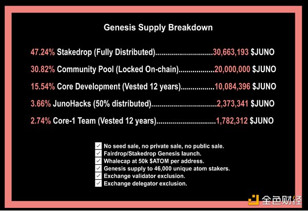 Juno最近正處于一個極具爭議性的治理建議中心。作為其代幣分配的一部分,JUNO將其47%的供應量分配給ATOM質押者。雖然有"鯨魚上限",以防止交易所等實體接收JUNO,但有一只鯨魚設法欺騙了空投,積累了250萬JUNO,按當前價格計算,價值約7500萬美元。這占代幣初始流通供應量的7.5%,占團隊12年歸屬期結束時預期供應量的1.3%。
