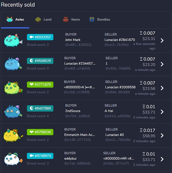 一是靠游戲中的寵物繁衍賺錢。玩家可選擇消耗產出的SLP幣來使兩只寵物繁衍后代,后代屬性由父母基因隨機決定。多次配種將有望繁衍出極品的寵物,但玩家的SLP幣消耗也會指數級增長。強力寵物既可直接出售換取現金,也可作為“生產工具”加入隊伍中以提升勝率,增加SLP幣產出。