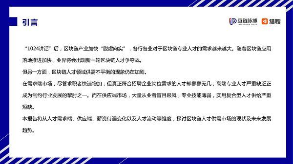 報告從人才需求端、供應端、薪資待遇變化以及人才流動等維度,探討了區塊鏈人才供需市場的現狀及未來發展趨勢。